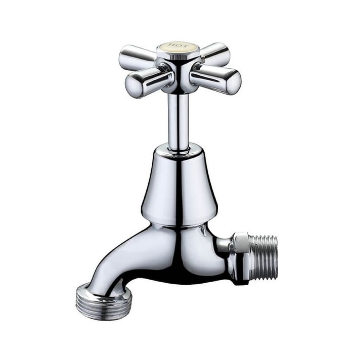 Chrome plated brass Hose Tap - Anti vandal, includes hot/cold and blue/red buttons and premium jumper valve. Max Temp 80 deg C. Max pressure 1000kPa.